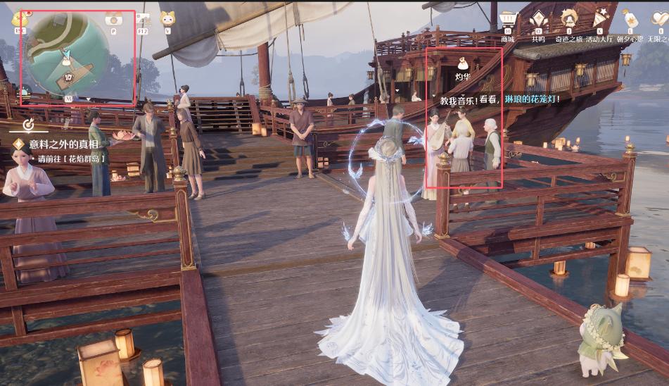 3、然后上船,到楼梯口,找这个NPC购买花笼灯,找不大看下图小地图