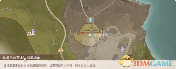 1、先传送到菲洛米亚女王行宫遗迹前,向东南方向前进。