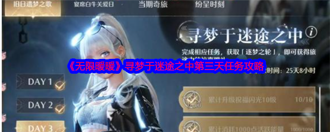 1.3版本传说季 |【寻梦于迷途之中】活动已经上线,活动任务分为四个部分,分别在活动的第1天、第2天、第3天和第5天依次解锁。其中第三天任务是升级祝福闪光10级、消耗1000点活跃能量、与蓝色宴席白牛合影、巅峰赛获18颗星,下面小编给大家带来了《无限暖暖》寻梦于迷途之中第三天任务攻略,速来围观吧!