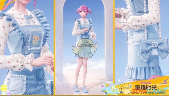 2、这套时装是牛仔裙,并且还有蝴蝶结形状的单肩包。