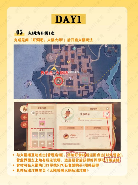 与火锅摊互动点击[管理店铺],添加好食材后返回点击[对外营业]营业界面左上角有玩法说明,适当经营后获得好评即可升级店铺食材可在火锅坊门口寻找NPC石老饕购买/闯关获得