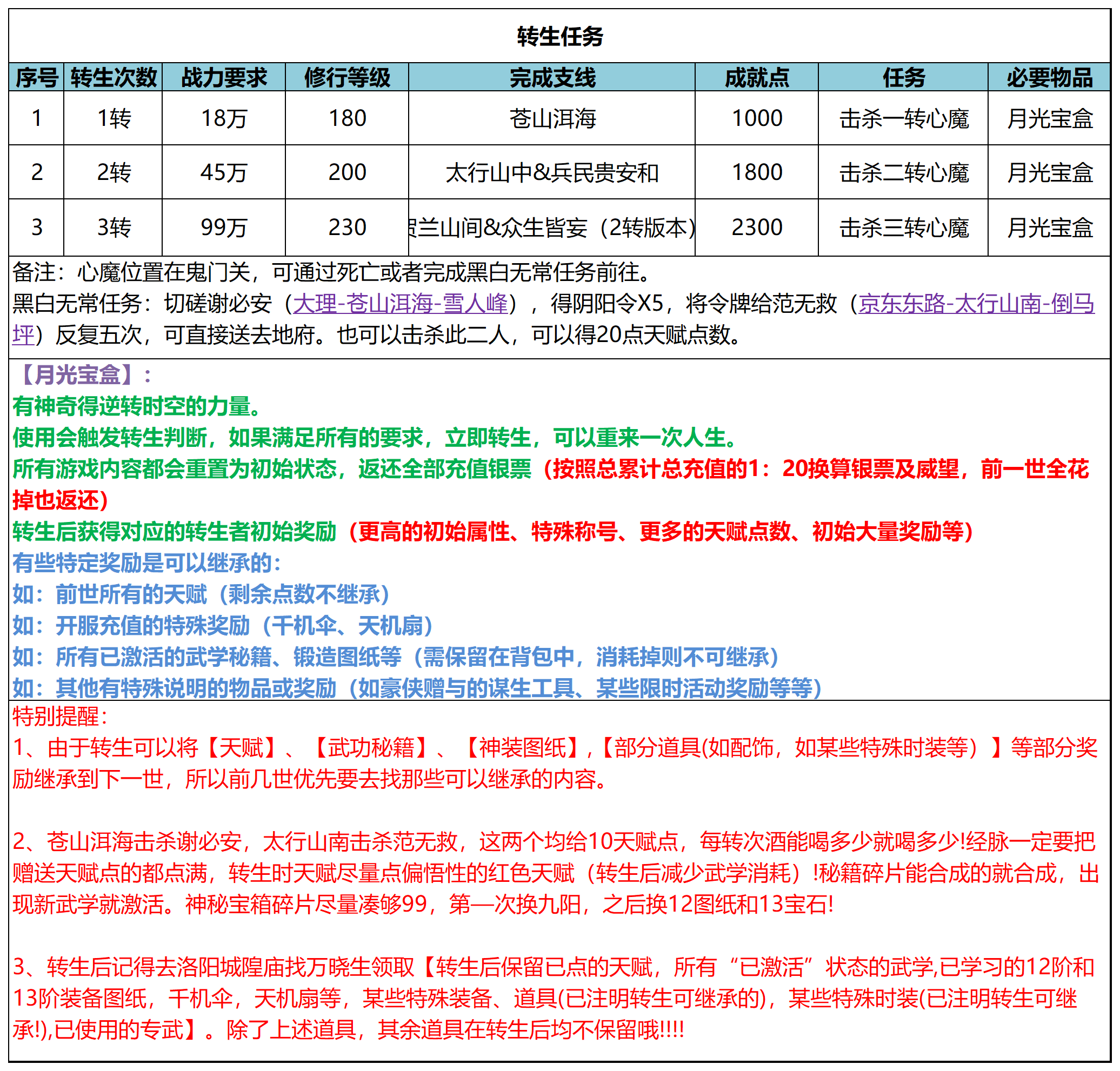 1、由于转生可以将【天赋]、【武功秘籍]、【神装图纸],【部分道具(如配饰,如某些特殊时装等)]等部分奖励继承到下一世,所以前几世优先要去找那些可以继承的内容。