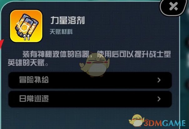 力量溶剂是超级幻影猫光痕游戏内的天赋材料,是一个装有神秘液体的容器,使用后可以提升战士英雄的天赋上限,需要通过冒险补给和日常巡逻的方式来获取这个材料,那么具体的获得方法是什么呢?下面就让小编给大家带来《超级幻影猫光痕》力量溶剂获得方法,感兴趣的继续往下看看吧。