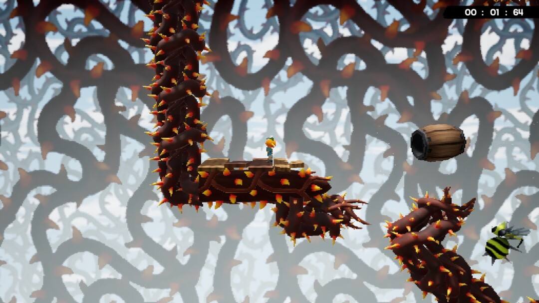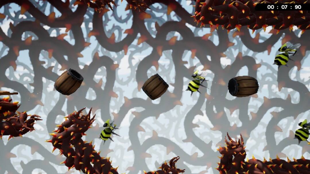 地图上会有很多木桶,操控南瓜杰克钻进木桶里,再被木桶发射出去进入下一个木桶。木桶的发射角度和力度都不需要自己手动调整,只需要寻找发射时机就好。地图上的尖刺和蜜蜂碰到了就嗝屁,但只要有充足的耐心就能轻松通过这关。
