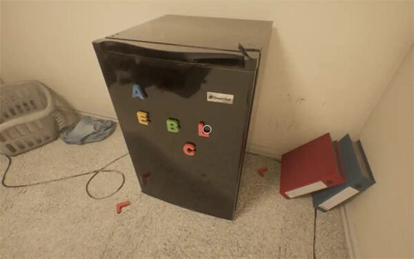 两个 L 字母磁铁在冰箱旁边的地板上,