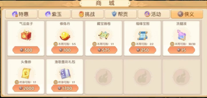 3. 侠义值平时帮助别人杀天师、妖王和藏器阁,送东西都可以积累侠义值,侠义值很好获取,侠义值每周可以兑换5个修炼丹,100一个。
