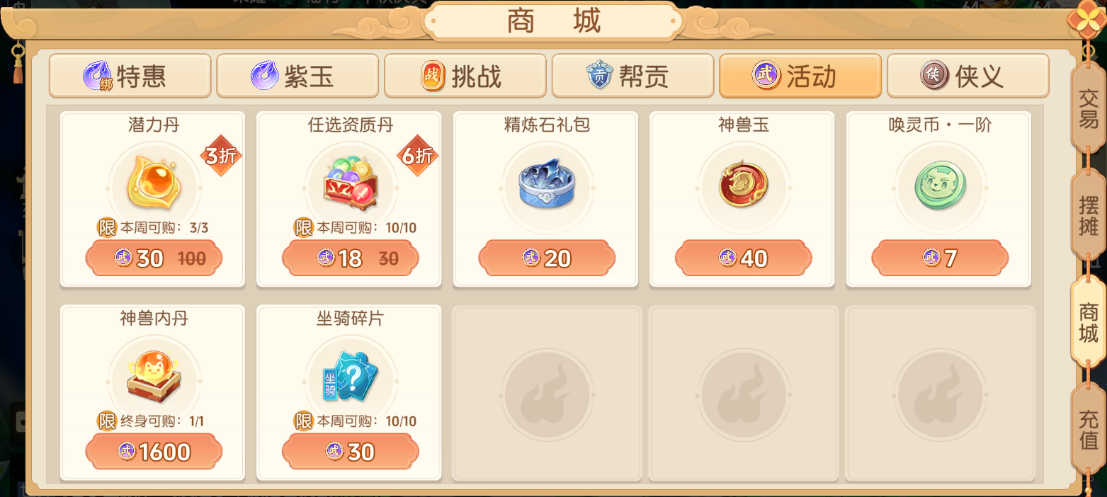 活动积分获取较为简单,限时活动和充值即可获得,因为活动积分可换物品质量较高,所以不要错过每天的限时活动(错过活动第二天无补偿奖励领)。另外有一定氪金能力的建议买每日礼包获取活动积分(按个人氪金情况)。