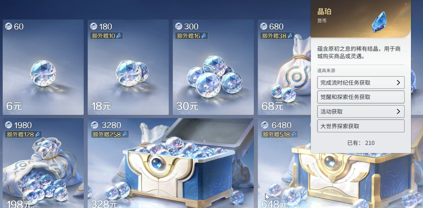 档位分为 6 元、30 元、68 元、128 元、198 元、328 元、648 元,每个档位首次充值可获得双倍璇晶,比例为 1 元等于 10 璇晶,双倍即为 20 璇晶,仅限 1 次,永久不重置。