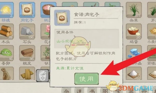 3、最后在弹出的食谱窗口中,点击使用即可解锁食谱的制作配方。