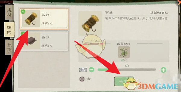 4、最后在织物选项中,点击葛丝,消耗葛草点击下方的制作即可获得葛丝材料。