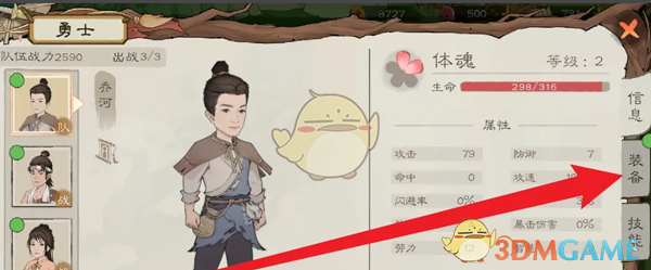 2、在勇士页面,继续点击右侧菜单栏第二个装备选项;
