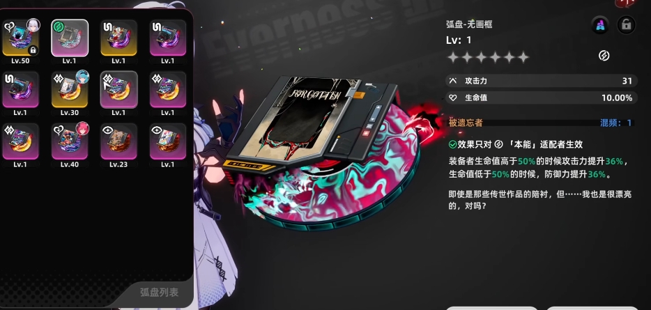 无画框是一件极具特色的武器,其精通效果与装备者的生命值状态紧密相连,当装备者生命值高于50%时,无画框能够提升攻击力,为装备者在生命值较为健康的情况下提供强大的输出能力,而当生命值低于50%时,无画框则会增加防御力,随着精通等级的提升这种攻击力和防御力的加成效果也会从精通1的攻击力和防御力提升36%,到精通5的提升72%。