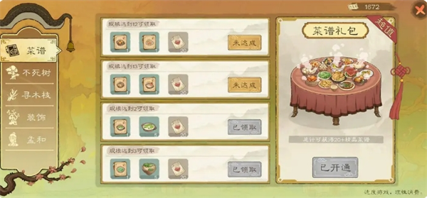 可获得部分菜肴的精品食谱,精品菜肴比凡品菜肴多10点饱食度以及10点营养值,同时精品菜肴在食为天活动中可获得更多的卷(多一丢丢)