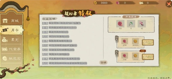 2、永久月卡就不用说了,功能强大,且每日能领取50桃花石,这点就完爆其他了,所以优先级第二