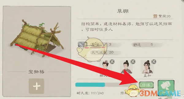 2、接着在建筑详情页内,点击右下角的修缮,通过修缮的建筑可以提升耐久度和居住人数、舒适度;