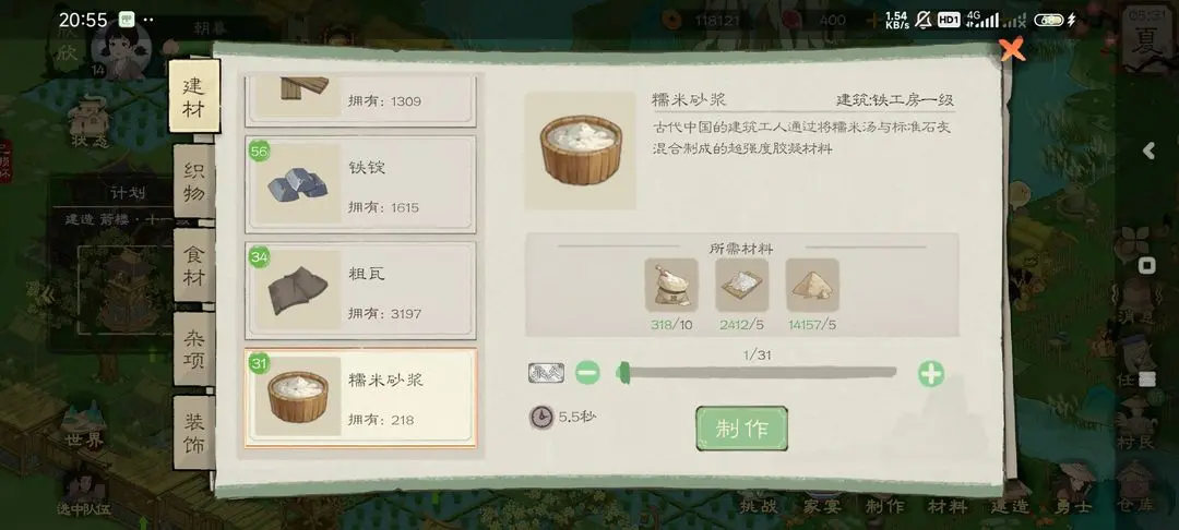 两天用半个小时测了糯米砂浆的生产效率,度过一天15分钟生产31个左右,还剩三个建筑(茶楼箭塔箭楼)升级200+170*2=540加上修缮200多一起凑整750,满打满算需要在线6个小时度过24天哈哈,不想活了真的,科技坊制作时间缩短到2级,早知道这样就全用来缩短时间好了还升级什么粮仓减少修缮材料啊,粮仓升了也是用来囤糯米继续爆仓的,九万的库存5万多的糯稻地里还有一大片石磨加工也有3万5,忘了自己糯稻升满级加成居然有200%,看了才发现别的作物他才加成100%,你也知道糯米用的多用的快啊,心如死灰,等着生产的时间又死了两个劳动力,熬走一批又一批的人