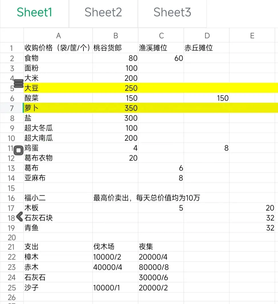 前期不会赚钱,每天就种地生产升级,每次都期待需要的东西打折便宜点,买各种铁块和种子开销真的很大,不打折的除非真的缺不然都不买,没钱了就靠着陵陵苟活,还好这两天觉醒了会赚钱了,因为开销实在太大了十几二十万铜钱的花,各种图纸木头一个比一个贵,还听说后期一个箭楼底座20万,宝宝们快一起多赚点铜钱吧