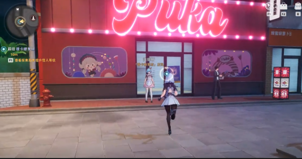 其实玩家在这一个便利店的外面,行人就会来来往往,会一起分析一起讨论。角色在这里穿梭时就可以看到街边有很多的涂鸦,在路过一家店铺时,醒目的招牌,还有可爱的橱窗装饰,也可以拼凑出一个不一样的氛围。