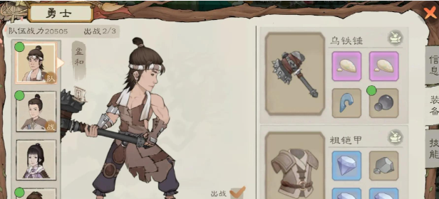 第二步开启装备。玩家进入勇士属性页面中,打开右侧的装备列表,这里展示了进攻铁剑、防御布甲等。