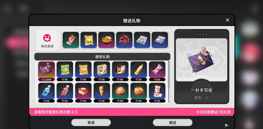 操作路径清晰直观:进入角色图鉴后点击目标人物头像(如娜娜莉),界面右下角会出现“礼物”图标,点击即可打开赠送面板。系统会优先在顶部区域高亮显示该角色当前偏好的物品类型,赠送契合度高的礼物将获得更高好感增幅;下方则罗列玩家已拥有的全部可赠礼物品,选中后一键送出即可完成交互。