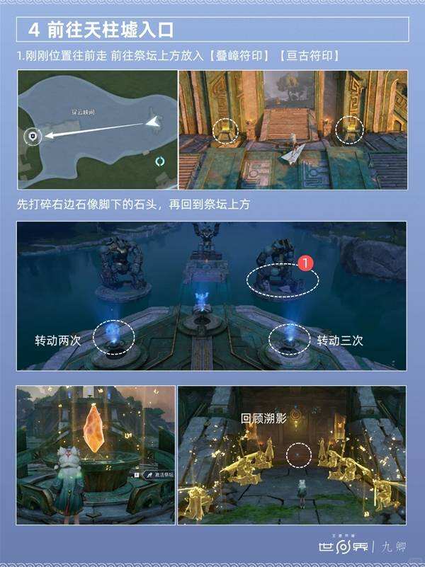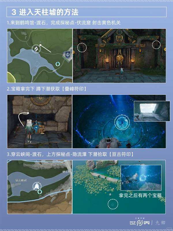 第二个符印在穿云峡间隐流谭,进入水下洞穴后就可以直接拿到第二个符印。集齐两个符印后来到穿云峡间西边高台处提交符印,然后触发雕像转动,之后去下方的高台将附近的碎石击碎,然后回到高台操作机关,左边机关转 2 下,右边机关转 3 下,然后回到雕像中间互动,拿到道具后跟随指引前往水下,开启宝箱后继续向前,点击传送按钮后会被传送到另外一个位置。