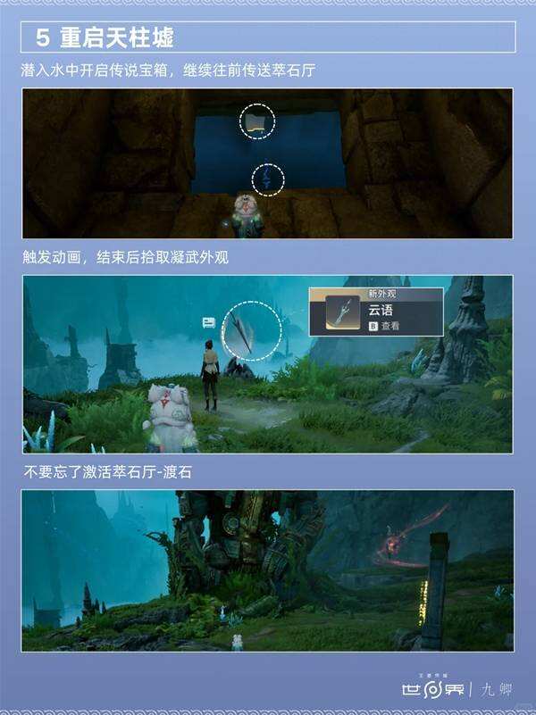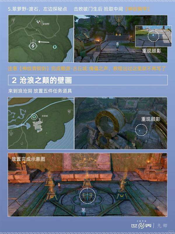 第四个在翠萝野附近的遗迹,传送过来后清完遗迹里的小怪就可以直接获得神纹胸甲。第五个在古丘城,传送过来后会触发元歌傀儡鲲游任务,跟着任务进度走就可以完成,期间会有 3 次场地演出,完成任务后可以获得一个元歌唤灵,完成任务后不要走,在房间里可以看到一个祭坛,和祭坛互动就可以获得青铜密纹剑。