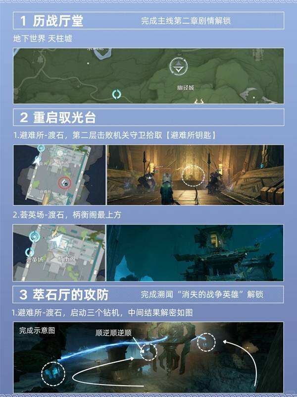 在该区域内上下穿行并踩踏隐藏机关,右侧将浮现一枚新镀石,务必及时激活。接着从左侧阶梯登顶,到达第三处机关点并完成激活,随即纵身跃下平台,集中清理下方深坑内全部敌对单位。再次调出地图,传送至地下区域意识厅镀石点。抵达后转身面向前方士兵,拾取其手中发光的通行柱节。