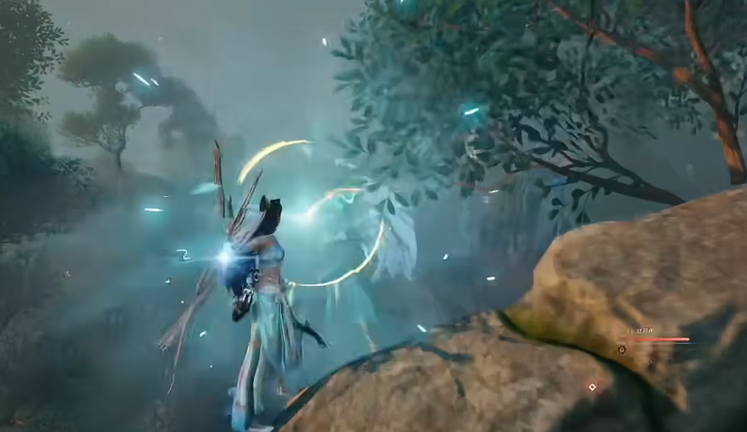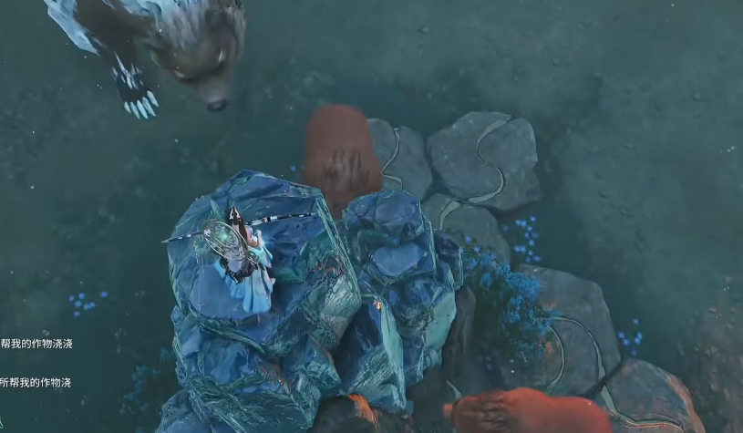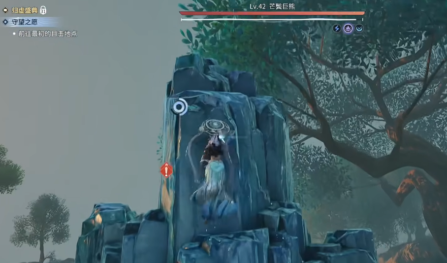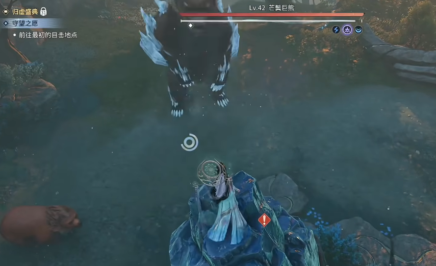 关键的走位在于绕后山引怪。玩家需要从左侧往山上绕行,到达熊的背后位置。在石头处使用普攻攻击一下 BOSS,成功拉住仇恨后,再往中间区域移动。这一步至关重要,决定了后续能否顺利卡位。