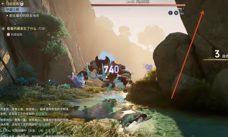 先绕到 BOSS 身后,吸引仇恨,将 BOSS 引到后方水坑位置,爬上面前的石头站到最顶端。
