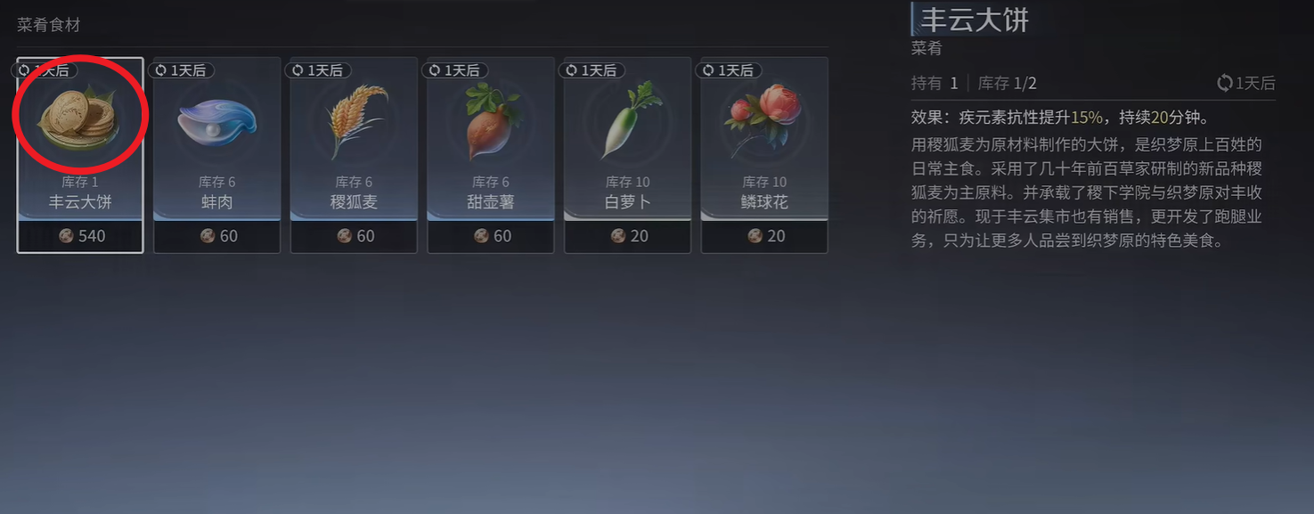 2、前置准备:打开地图导航到丰云集,找到 NPC 陈迪,购买道具「丰云大饼」。