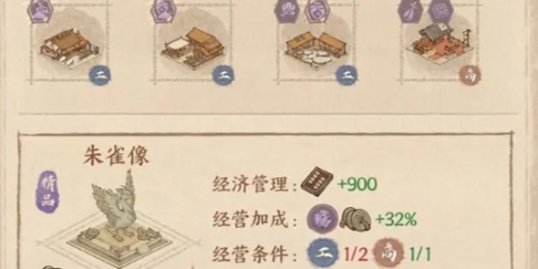 1、朱雀像可以放在坊市,搭配两个木枋,一个盐池和一个酒楼就能让它的收益达到最大化。