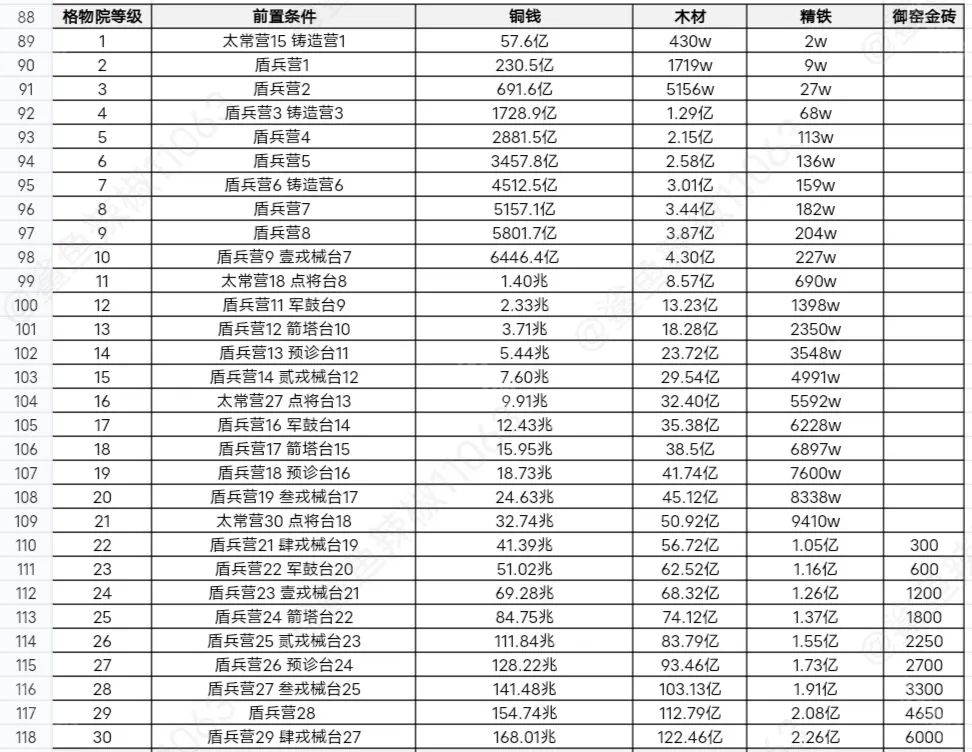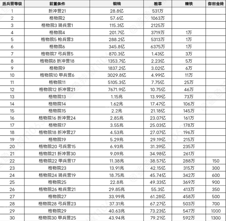格物院的升级又需要盾兵营的等级,因此盾兵营也不能被卡住,也要注意它的前置条件