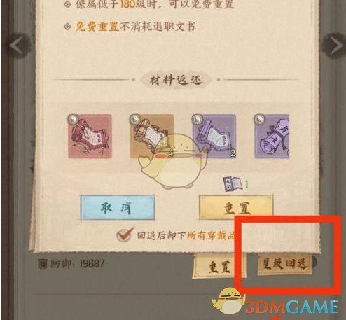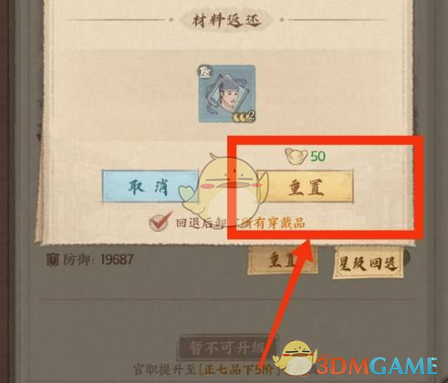 6、最终确认并重置:系统会显示所需元宝数量及降星详情,核对无误后再次点击“重置”按钮完成操作。