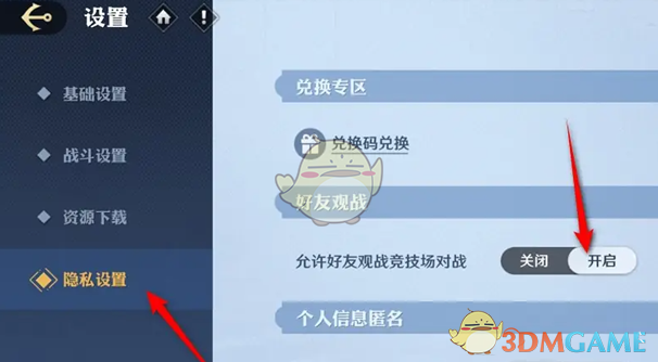 答:前往设置页面,找到隐私设置,选择好友观战,将该功能开启即可。