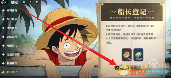 首次绑定奖励:金币*100、贝里*100000