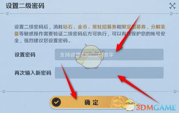 3、在弹出来的二级密码页面,输入4-8位纯数字密码,再次输入密码确认,点击确定;