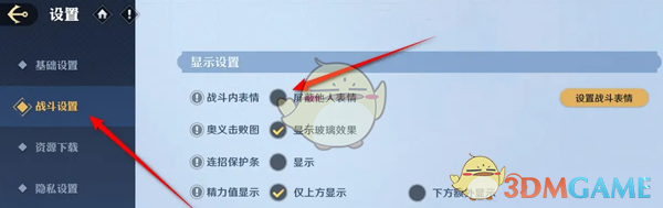 2、在设置页面,点击菜单栏内的战斗设置,选择战斗内表情进行设置;