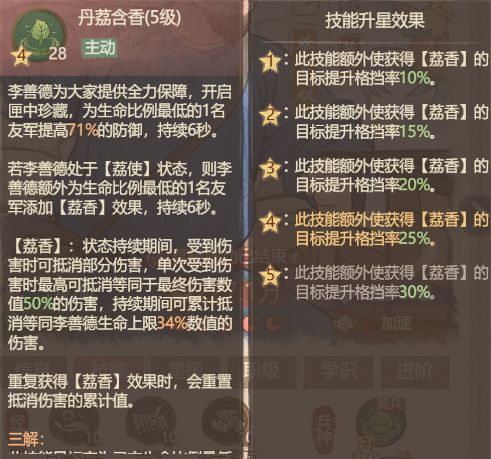 我们再看一下李善德的技能,这。。。看起来好像差不多。。。比他少了10%的基础生命恢复。那么再看看技能升星的效果,是自身处于绛雪状态放大招时,让自方攻击力最高的僚属造成的物理、法术伤害最高提升至20%,持续8秒。