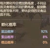 1、灵禽品质分为蓝、紫、橙等,橙品灵禽属性更强,但孵化概率很低。