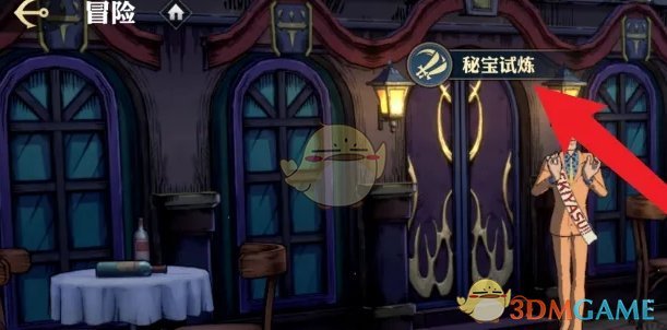 2、进入冒险玩法后,点击主页的秘宝试炼前往;