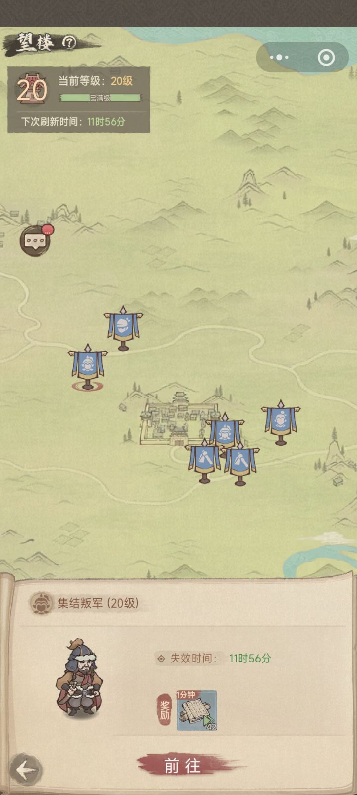 1. 望楼最高20级满级,每12小时会刷新一次情报任务(任务类型随机:山贼、援助、采集、擂台、叛军);