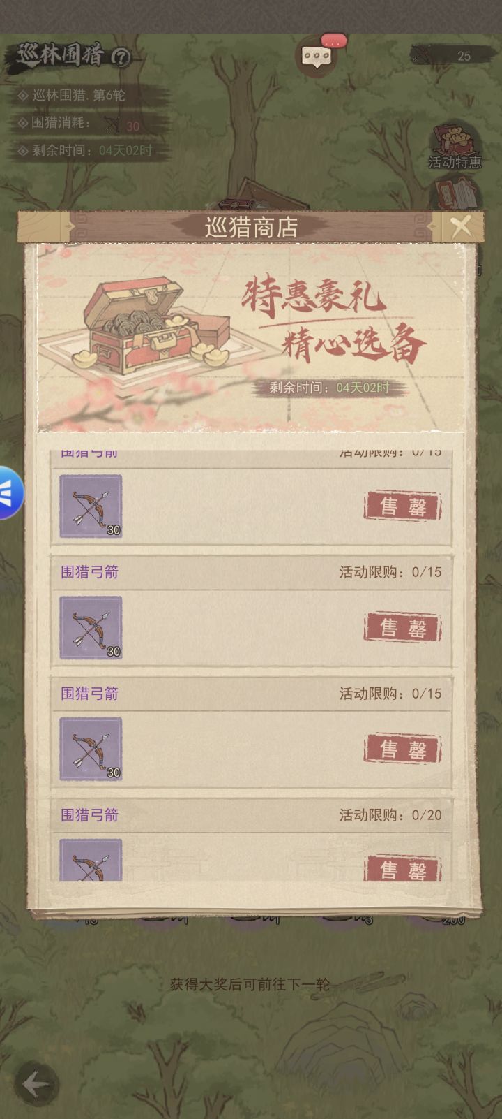 外围优先:每轮围猎开局,先射地图的四个边角!不用先射中间,边角更容易快速找到线索,省弓箭。