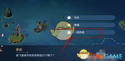 3、对应的题目答案,第一题是橡皮之果;第二题答案是东海,第三题答案是一切肉类。