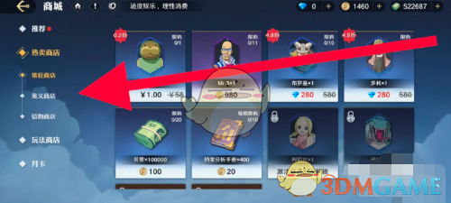 1、首先我们需要进入到游戏主界面,点击商城,在左侧导航栏选择奥义商店。