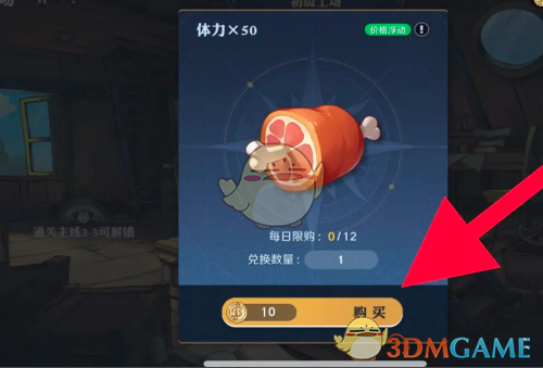 3、触发体力弹框,点击下方的购买,消费10金币即可购买50体力,每日购买上限是12。