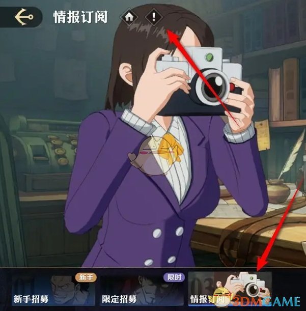 2、然后在招募玩法中,点击下方的的情报订阅,继续右侧的感叹号;