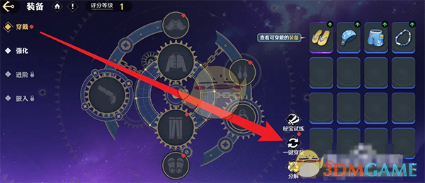 答:在装备页面,点击右侧的一键穿戴按钮即可完成装备。