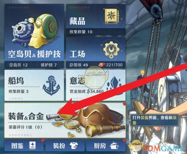 2、然后在弹出的菜单栏详情页内,点击装备&合金功能前往;