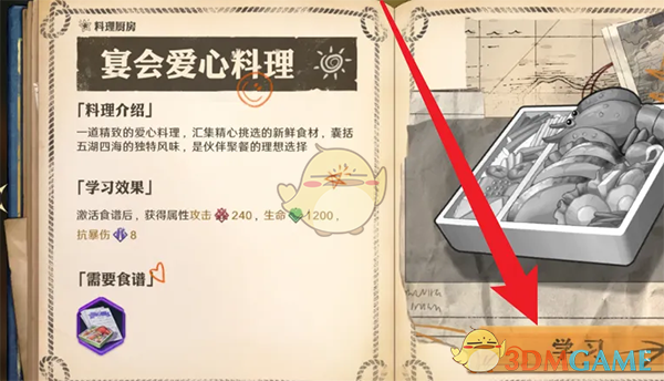 4、最后在食谱内,点击右下角的学习,即可激活食谱获得攻击、防御等属性;