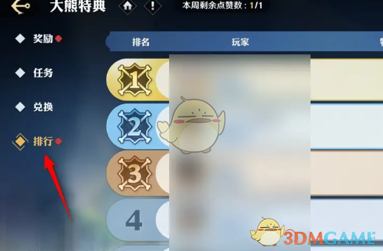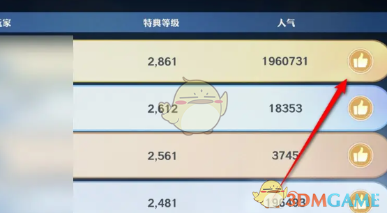答:在特典页面的排行列表中点击点赞图标。